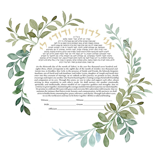 Botanical Ketubah, Watercolor Leafy Ketubah with Light Greenery Background