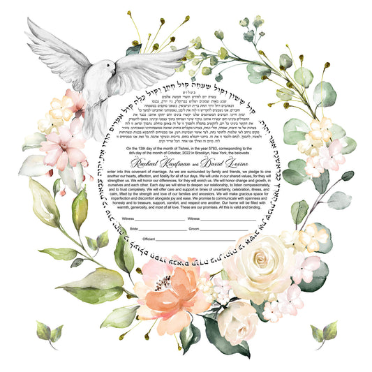 Elegant Watercolor Floral Ketubah with Dove, Flower Ketubah with Hebrew Phrase